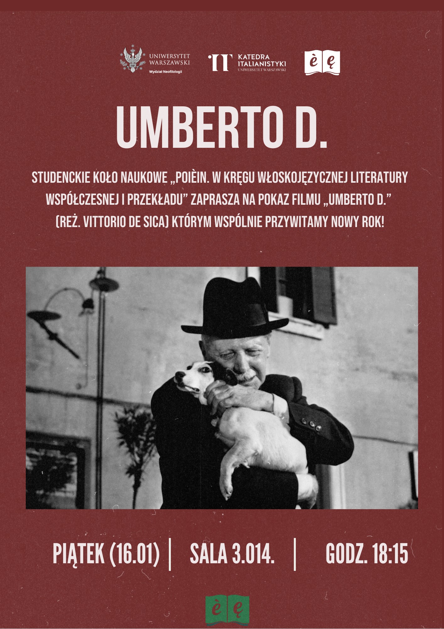 Studenckie Koło Naukowe Poièin. W kręgu włoskojęzycznej literatury współczesnej i przekładu serdecznie zaprasza na pokaz filmu “Umberto D.” (reż. Vittorio De Sica).